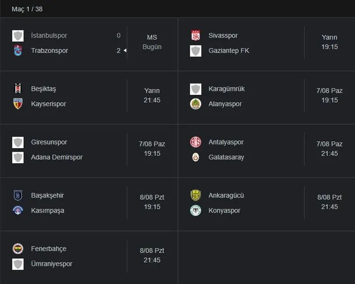 “Süper Lig Puan Durumu” Ligin ilk haftasında oynanan İstanbulspor – Trabzonspor maçının ardından futbolseverler tarafından merak edilerek “5 Ağustos Süper Lig Puan Durumu Sıralaması nasıl?” şeklindeki soru aracılığıyla öğrenilmeye çalışılıyor.