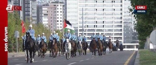 Mahmud Abbas’ın bulunduğu makam aracını, Cumhurbaşkanlığı Külliyesi önündeki caddede karşılayan süvariler, araca protokol kapısına kadar eşlik etti.