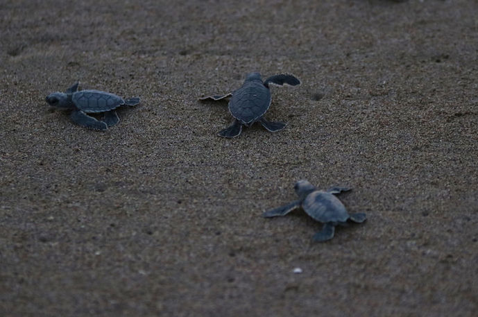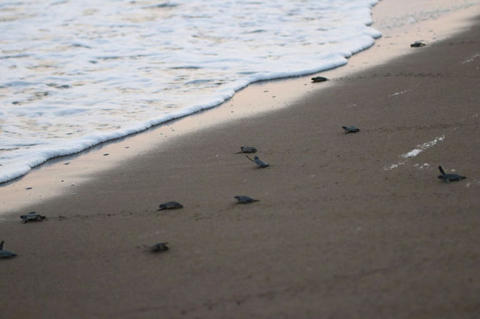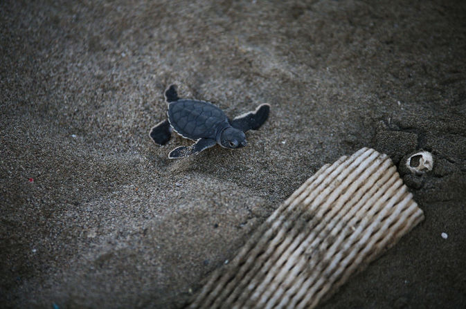 Minik deniz kaplumbağaları, kumsala ilk adımlarını attıktan sonra denize ulaşmak için zorlu bir mücadele veriyor.