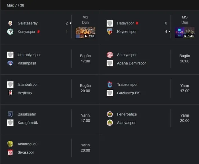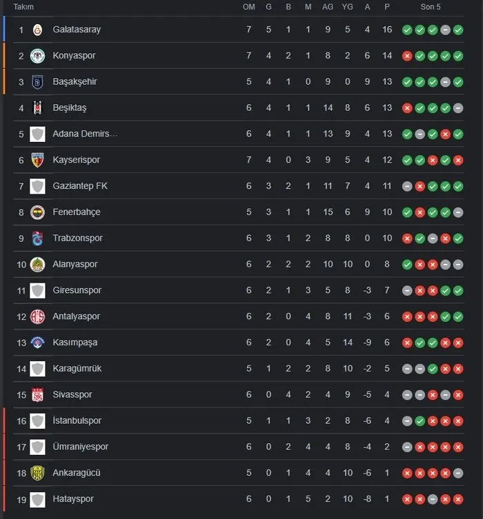 Süper Lig Puan Durumu Sıralaması Tablosu verileri ve 7. Hafta fikstürü detayları şöyle;